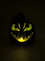 This piece is raku fired. After throwing, carving, bisque firing, and glazing, it is once again placed in a kiln and then quickly heated to around 1750 degrees Fahrenheit. After which, it is taken out and placed in a lidded trash can full of combustibles. The lidding of the trashcan, once the combustibles have caught fire, contributes to the matte black aspects of the piece (the stem). Any "flashing" is caused by the glazes achieving very high temperatures and quickly cooling, freezing the color change in place.