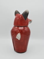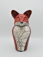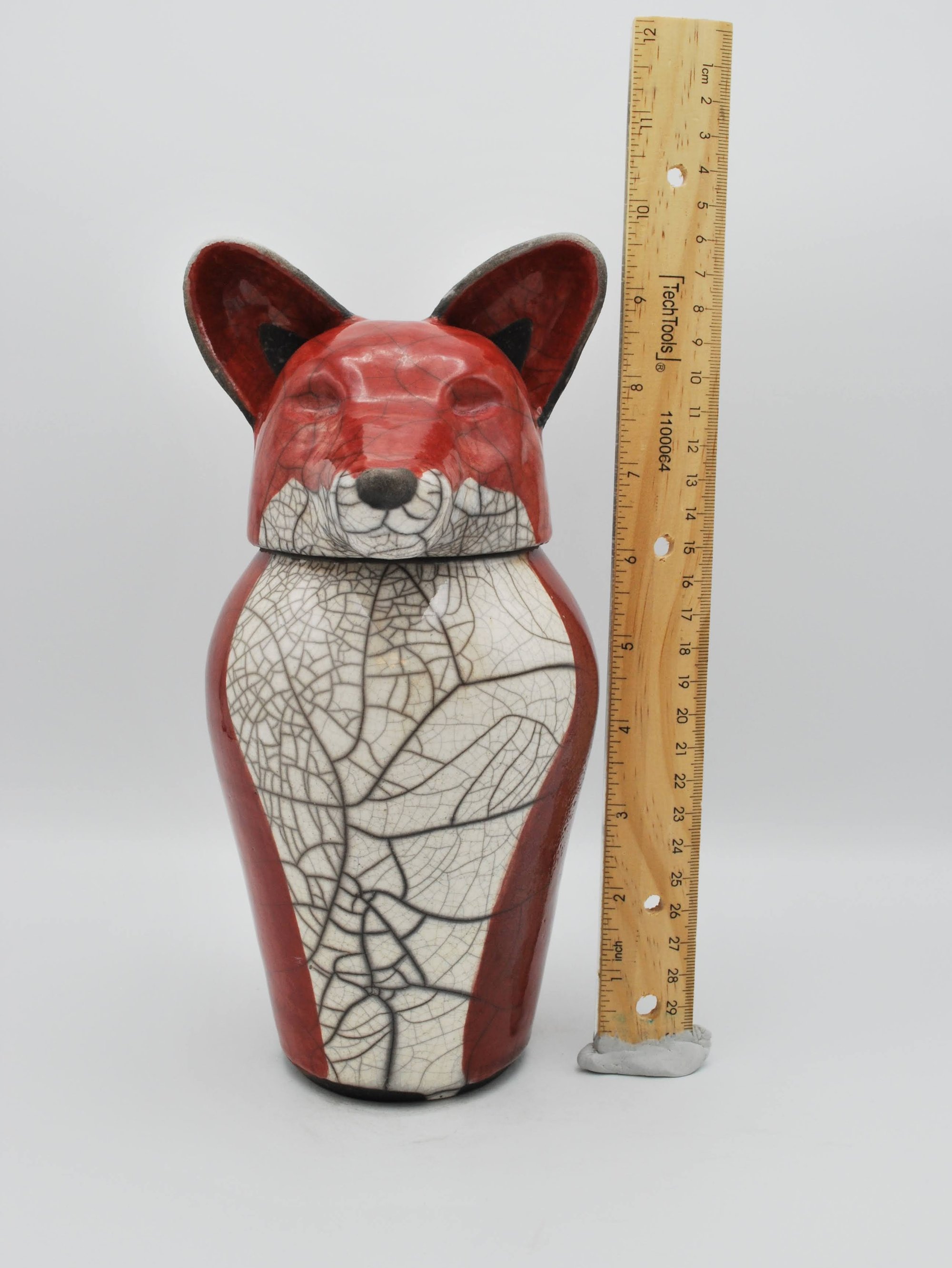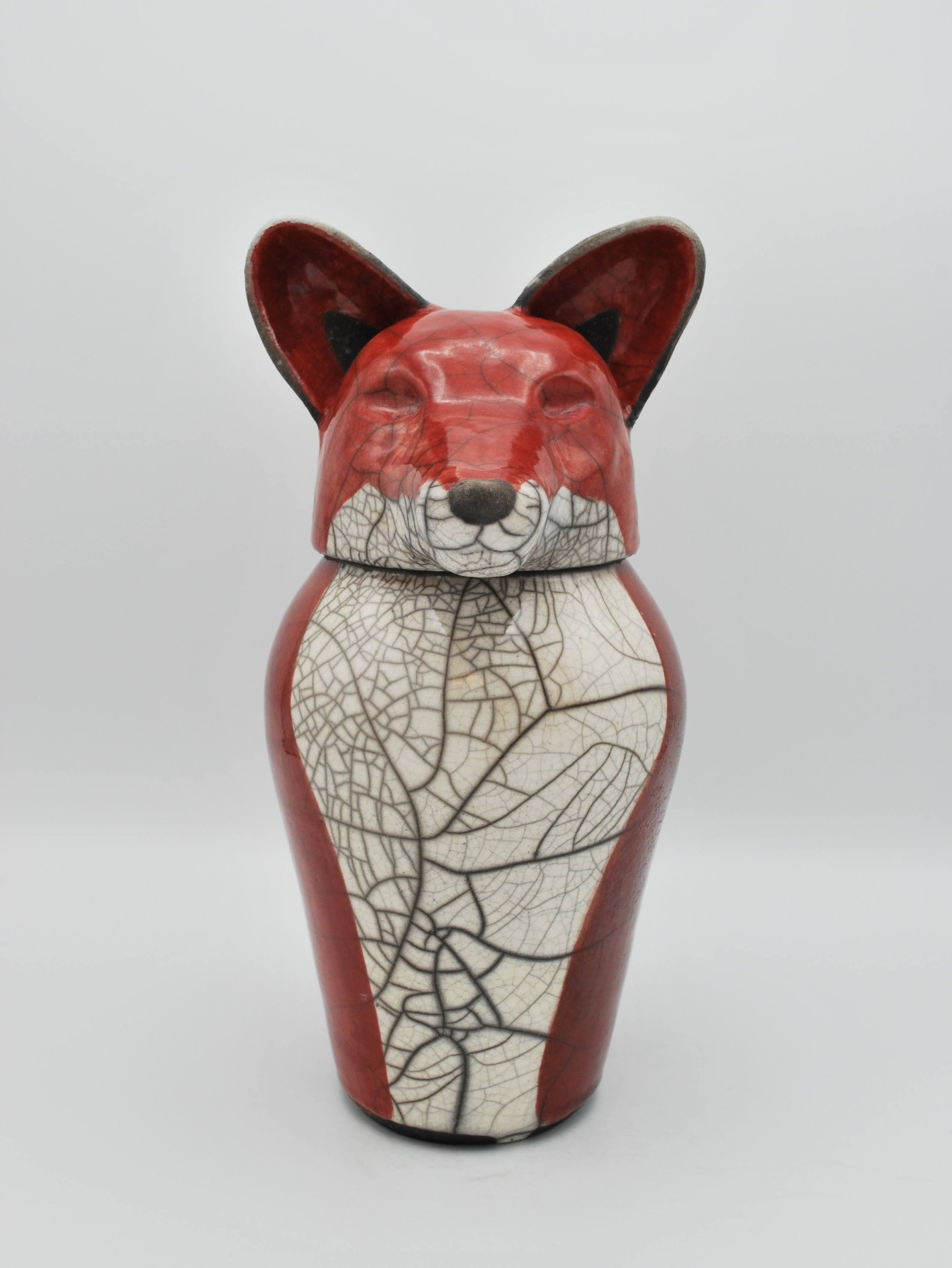 This raku fox jar consists of a wheel thrown body and head, upon which the animal features are sculpted. Can be used to stash cash, as an urn, or just a decorative piece.